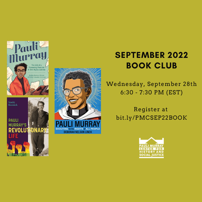 The Pauli Murray Center's September 2022 book club discussion will be on new young adult and children's books about the Rev. Dr. Pauli Murray. There are three options - participants can choose to read one or more of these:
